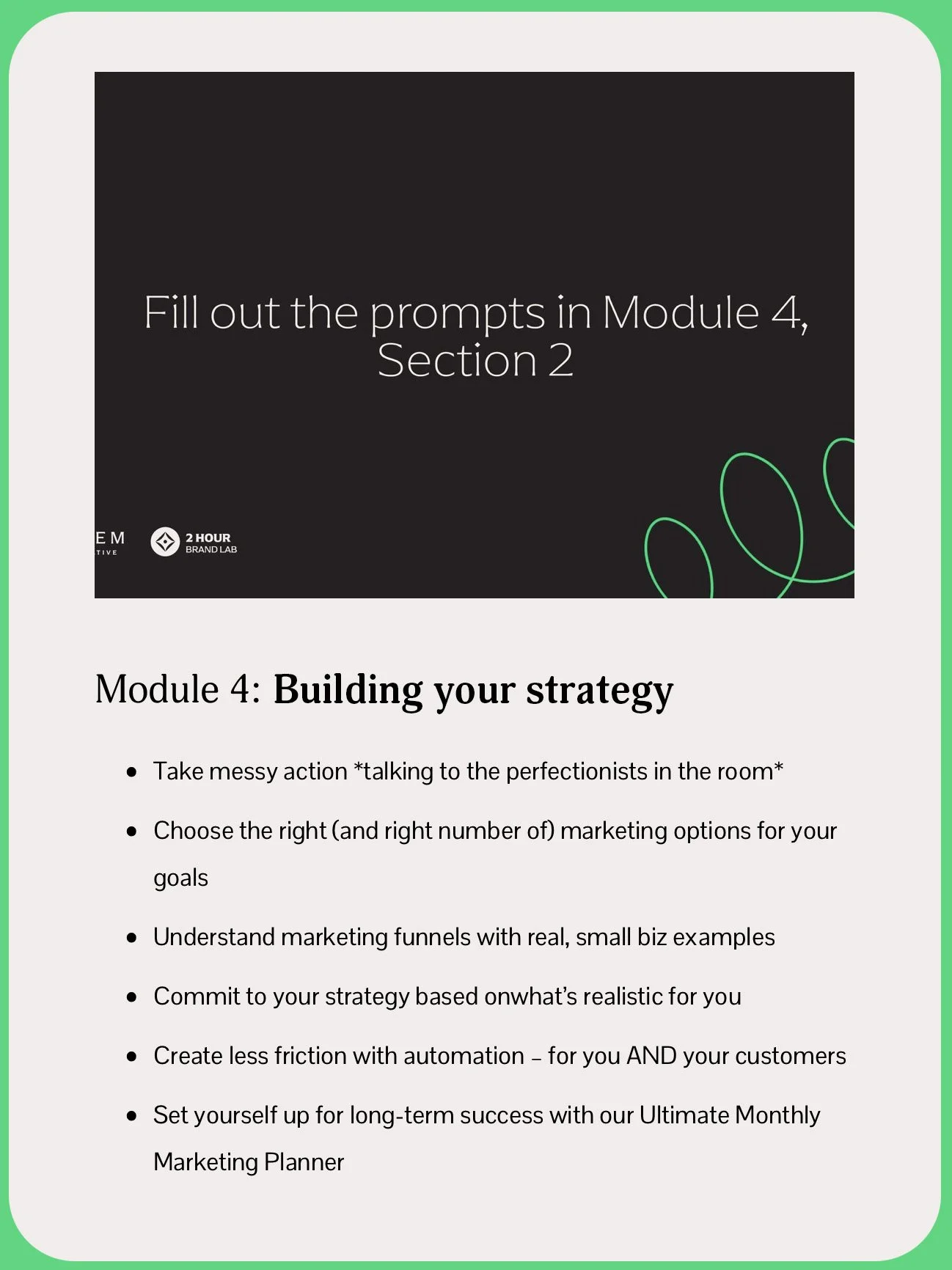 The 2-Hour Brand Lab can be done at your own time and pace. The course is 4 video modules and a companion workbook that is meant to be completed in real time as you watch the video. We’ve included templates that you will use each month in your business to implement your marketing strategy. When you buy the course you will have access to this content for a full year, so you can always go back and revisit the lessons.